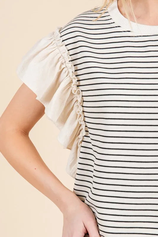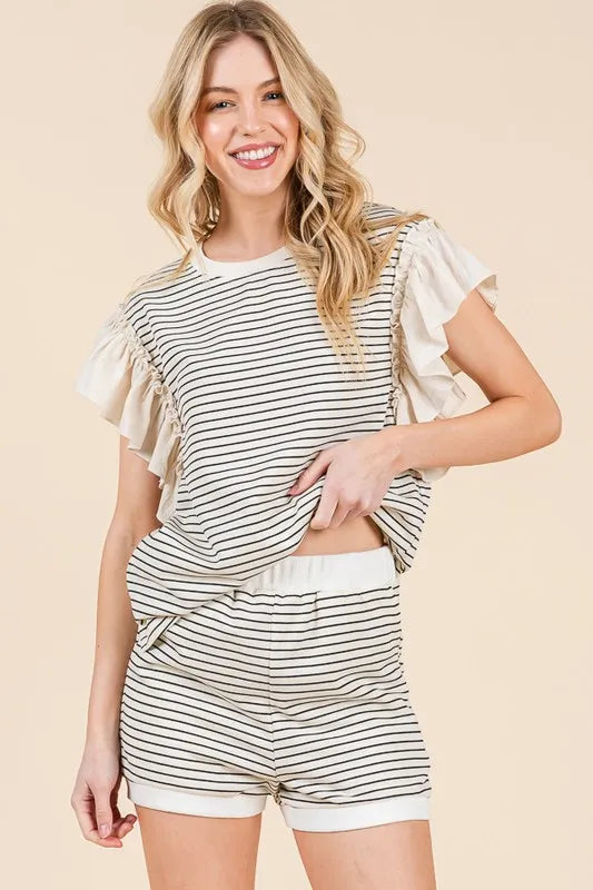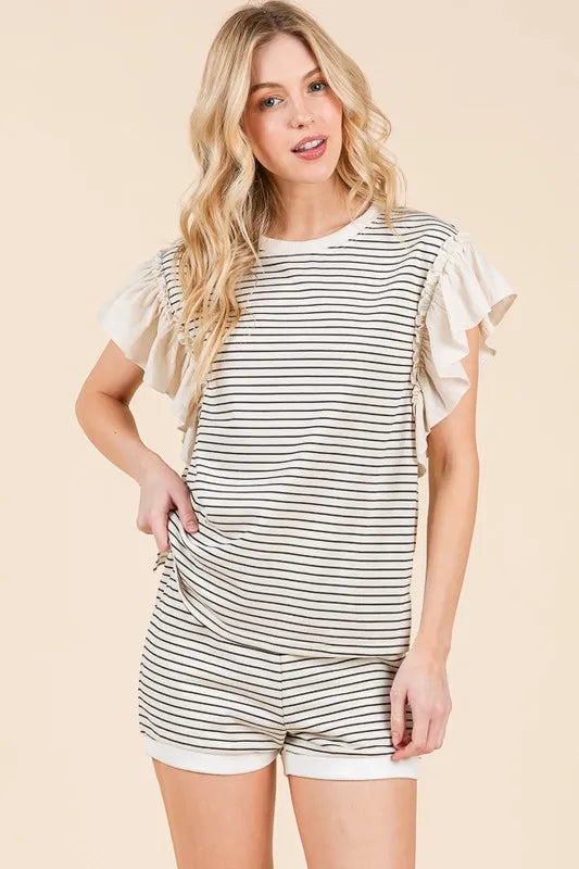Get ready for summer in style with this matching set featuring a striped ruffle sleeve round neck top and shorts. The ruffle sleeve detailing adds a playful and feminine touch to the top. The striped pattern creates a fun and trendy look for the season. Perfect for a coordinated and fashionable outfit that's both comfortable and chic. Stay cool and on-trend with this versatile top and shorts set.